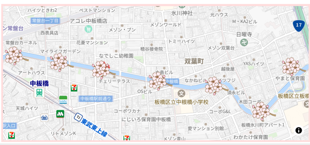 東武東上線・下赤塚から4駅先の中板橋駅より徒歩5分という近さにある、石神井川沿いには見事な桜並木が続きます。前日までの雨も上がり、当日はまさに絶好のお花見日和。中板橋付近から加賀方面まで、約900本の桜が咲き誇り、区内屈指の名所らしい華やかさに包まれました。