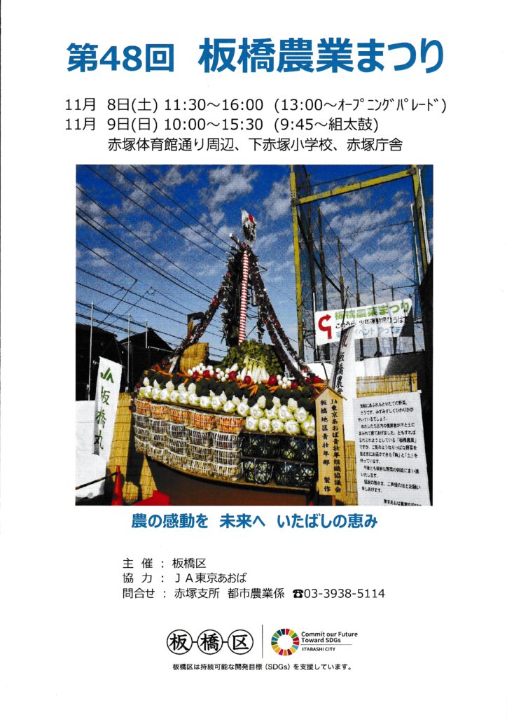 秋晴れの土曜日、赤塚体育館通り周辺で開催された「第48回板橋区農業祭」に行ってきました。今年のテーマは