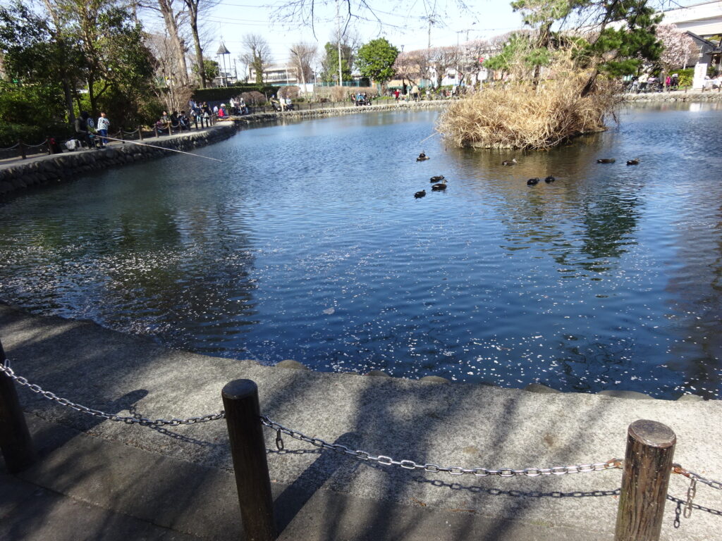 梅の花びらが浮かぶため池