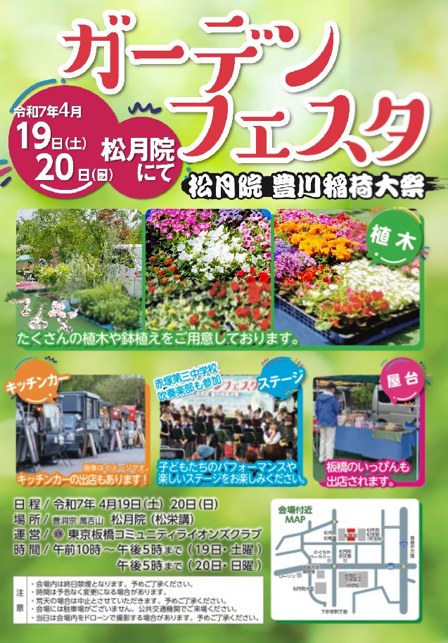 春のやわらかな青空に包まれた4月18日(土)・19日(日)、板橋区赤塚の名刹・松月院の境内で、恒例となった「ガーデンフェスタ2026」が開催されました。 歴史ある寺院の静けさと、色とりどりの花々が織りなす華やぎが調和し、まさに“春の庭園”を歩くような心地よい2日間となりました。