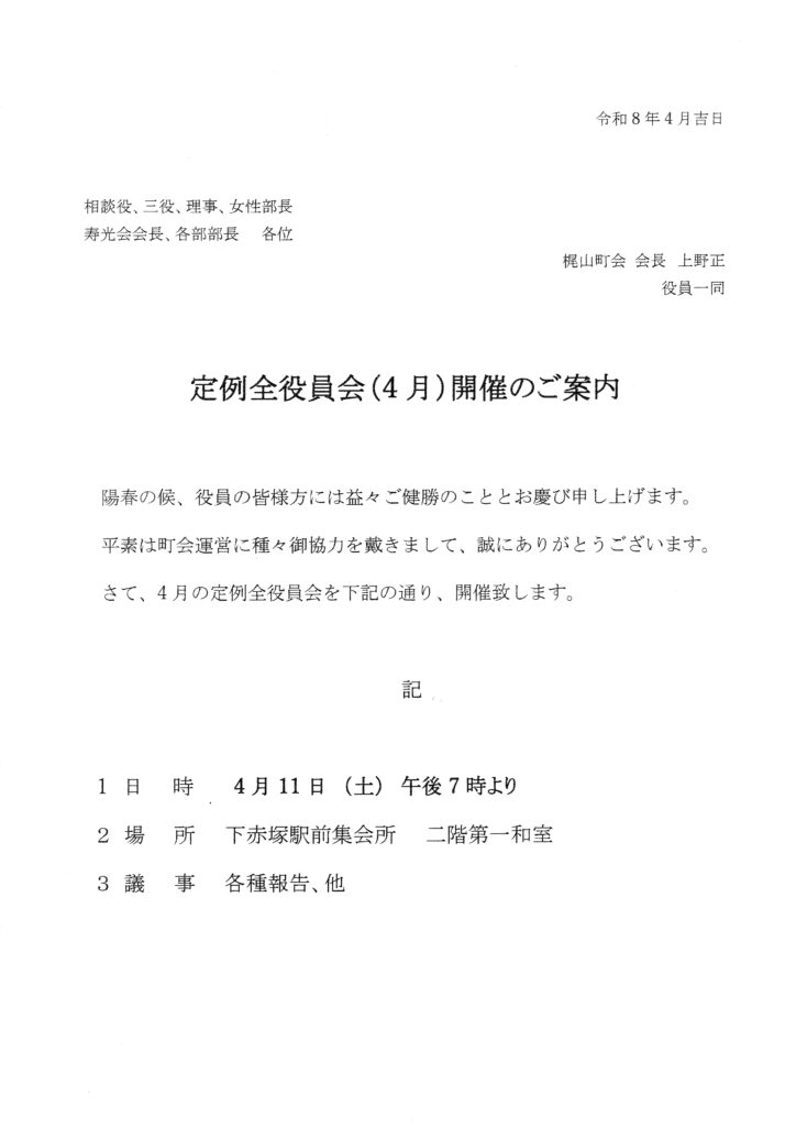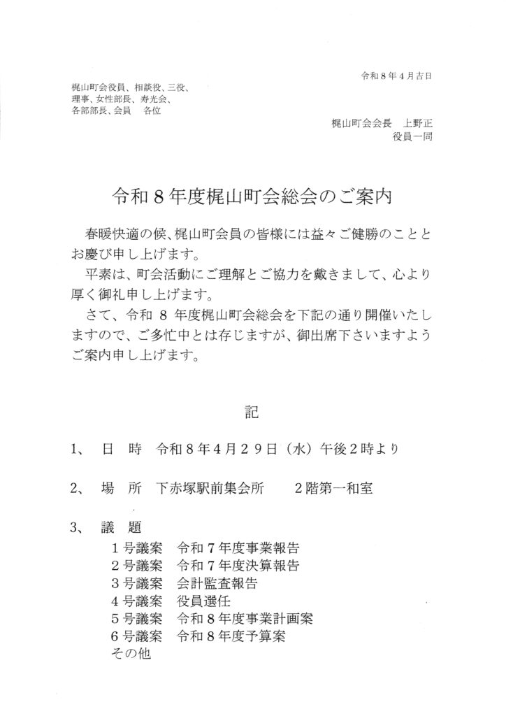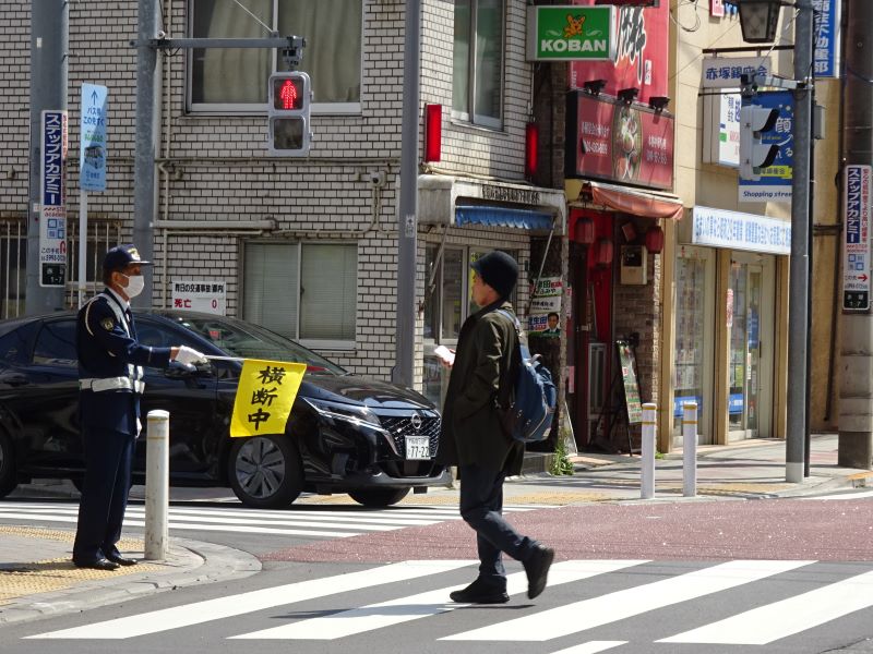 梶山町会交通部(高島平交通安全協会第5分会)の皆さんが町会内3か所の横断歩道にて、朝8:00時よりと午後1:00時よりに小学校の児童の通学及び一般の方々のが事故の無い様「横断中」の旗を振って見守っていますので、見かけたら「お疲れ様」とお声掛けください。